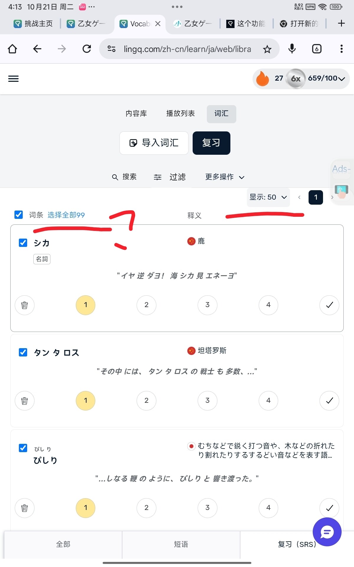 这里有个显示错误,我只让它显示了50个词汇,但是显示选中了99个词汇,这不是什么大问题,但依旧是个错误,请修正