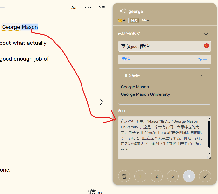 我识别的是george,但是出来的释义是后一个词汇mason的,请解决,一篇文章几个词汇会有这样的情况。 这是课程链接,登录 - LingQ