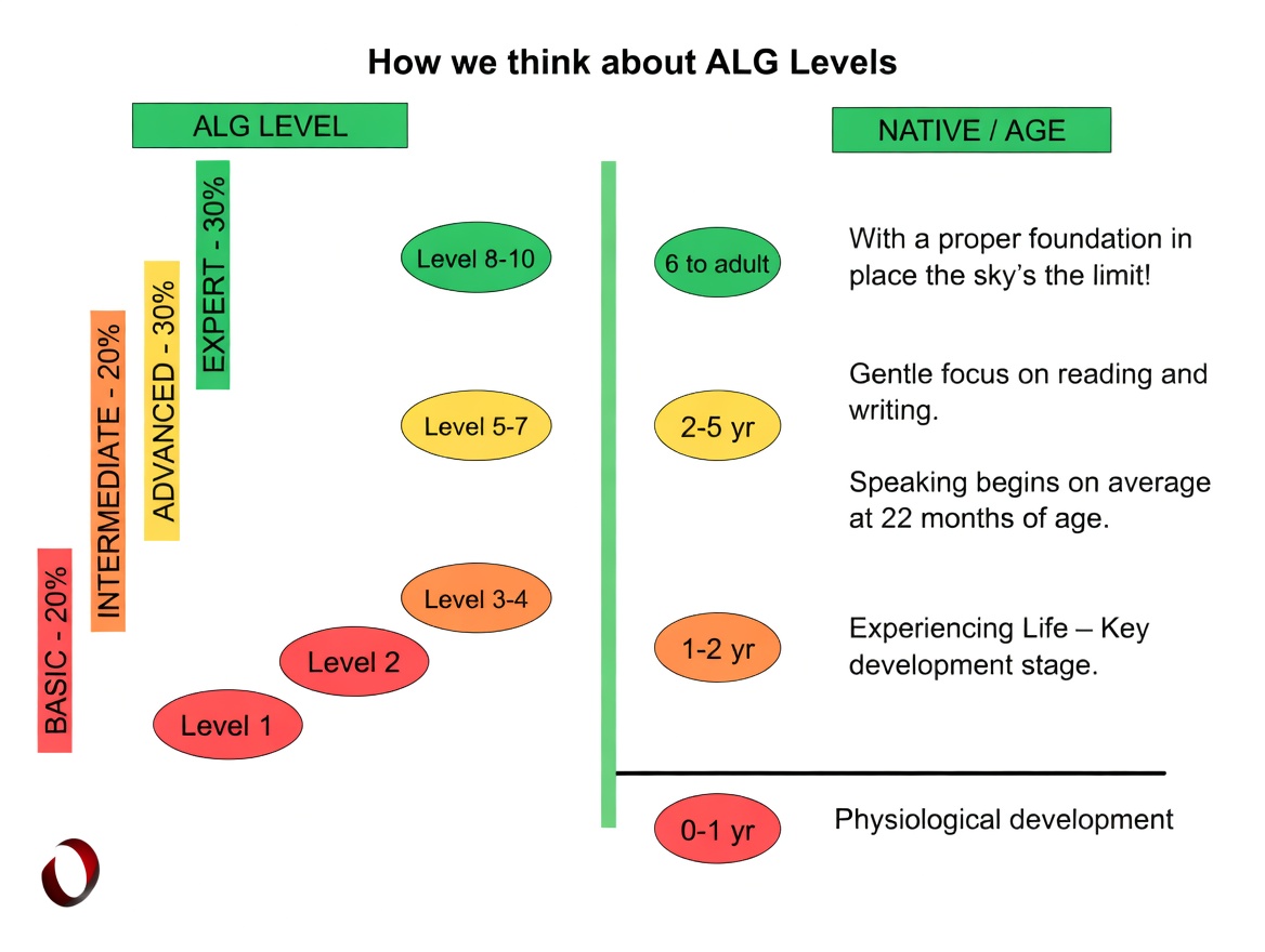 The idea is that language learning follows the same natural path as a child acquiring their first language. ALG breaks progress into 10 levels (roughly 200 hours each), grouped into Basic, Intermediate, Advanced, and Expert.