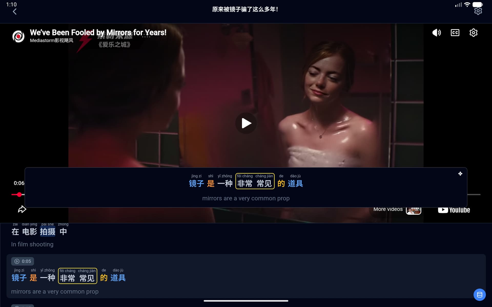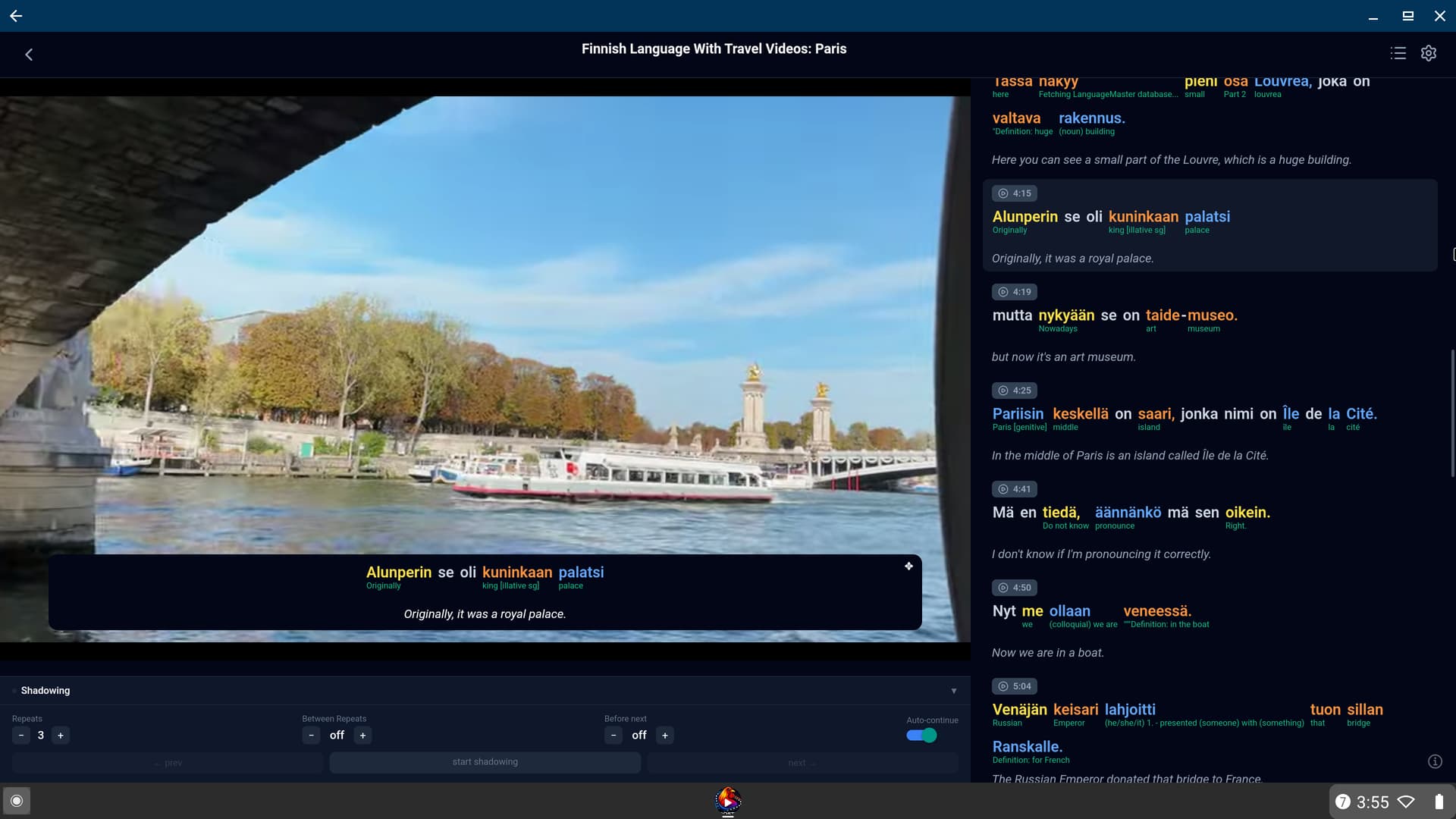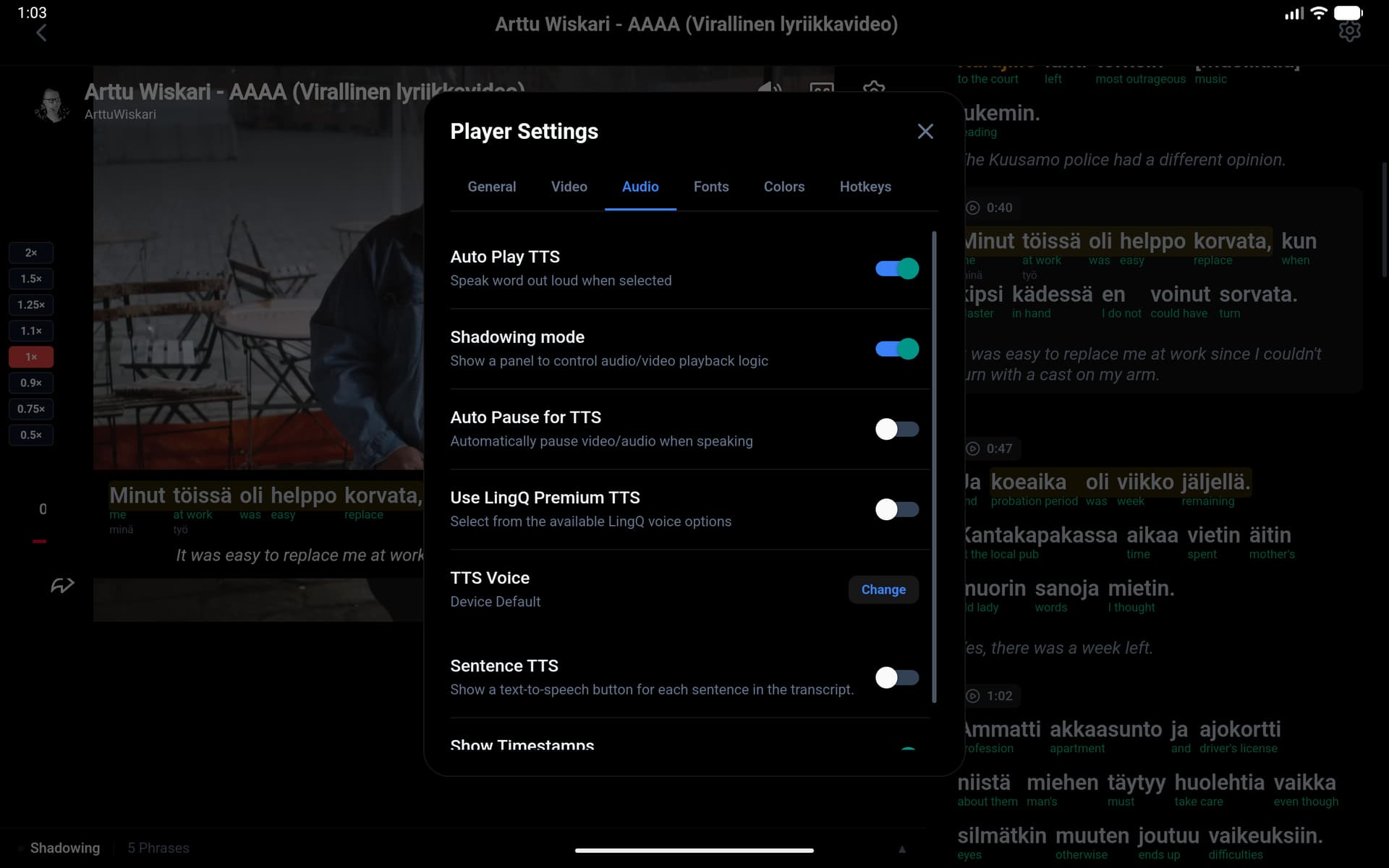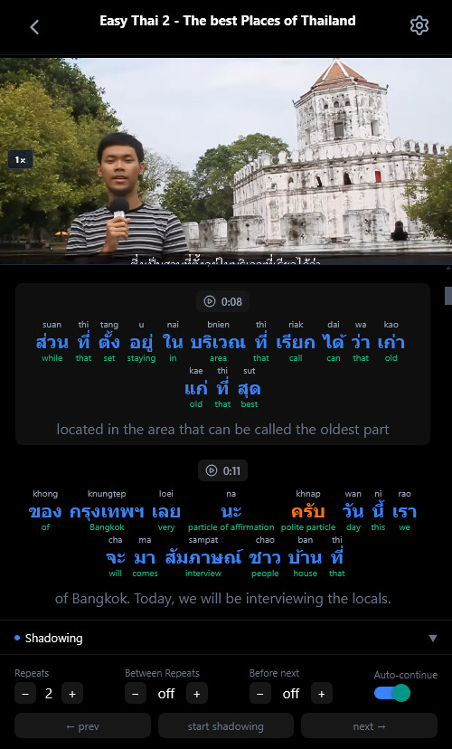 - Shadowing Mode: Audio/video practice with customizable sentence looping and adjustable pauses.