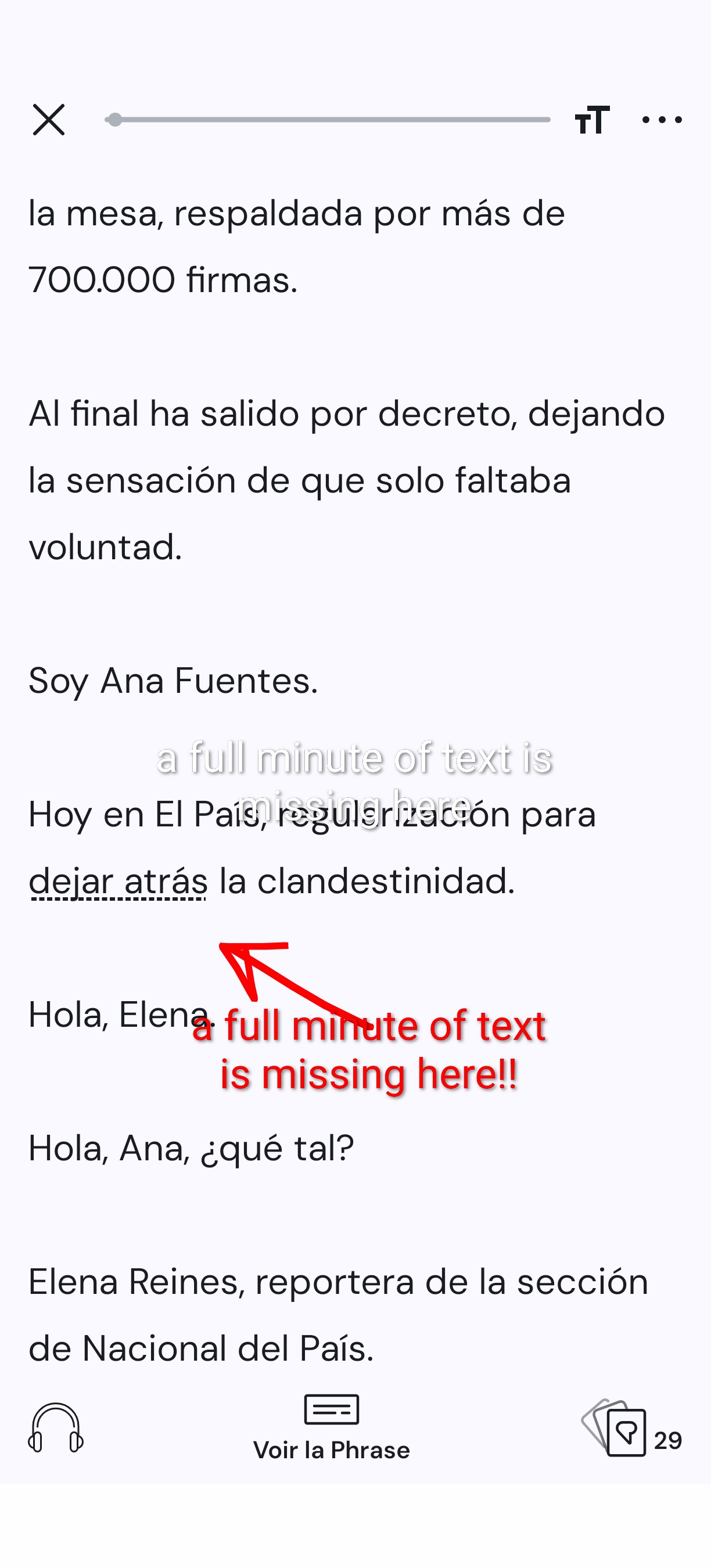 You can witness the problem by playing the audio with the embedded player below and reading the text in the screenshot below.