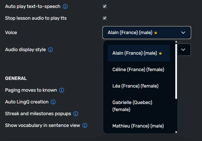 @len1984 You can change your TTS voice in the reader settings. You can see Ai voices identified by their tier icons. InWorld voices show the Premium crown. The keyboard shortcuts work in the Reader. This update means that hitting d when you are on a blue word will open the widget and check the default dictionary and centre your cursor in the meaning field. Make sure any popup blockers are off. The simplification option is available in the lesson menu in the reader.