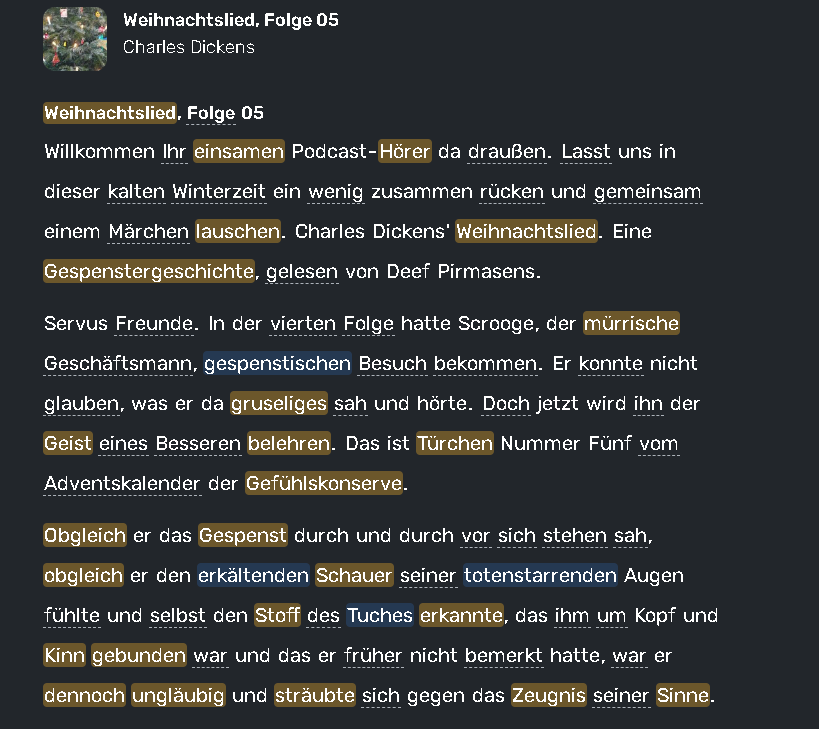 Hello, I have some questions, or at least I’m looking for some opinions about how to learn German, my native language is Romanian, not English. In the last 194 days, I spent 377 hours listening + 3.2M words read in German on Lingq. +I have been living in Austria for 7 months, so I have a little more “learning” time. And in the next year (the next 300-400 days) I want to reach the C1+ level because I want to be “material” for college. I can understand and read quite decently, depending on the theme and the level of the book. I will attach 2 pictures of different lessons to show you how I see a certain text, and how much I understand. All this sounds good until I hit the grammar and when I start speaking.