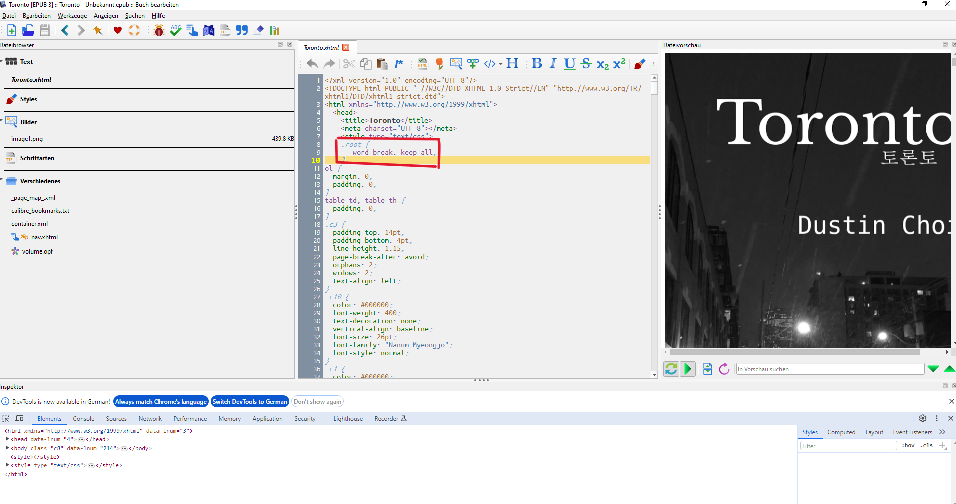 In regards to word splitting. When I import E-books I firstly modify them using Calibre. If you go to the modify book section, you can usually find a style sheet document that handles the default look of the text. It is often named default.css. In the body or root section, depending on what you find, add the line word-break: keep-all;