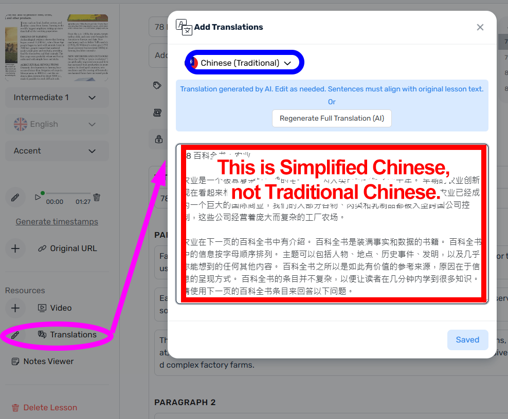 I am a Traditional Chinese user. When I imported a lesson, the AI automatically generated a Full Translation, but it displayed “Simplified Chinese” instead. I have to manually select “Show Translation” for each sentence in the “Sentence View” to change the translation back to “Traditional Chinese.” This issue is quite frustrating for me.