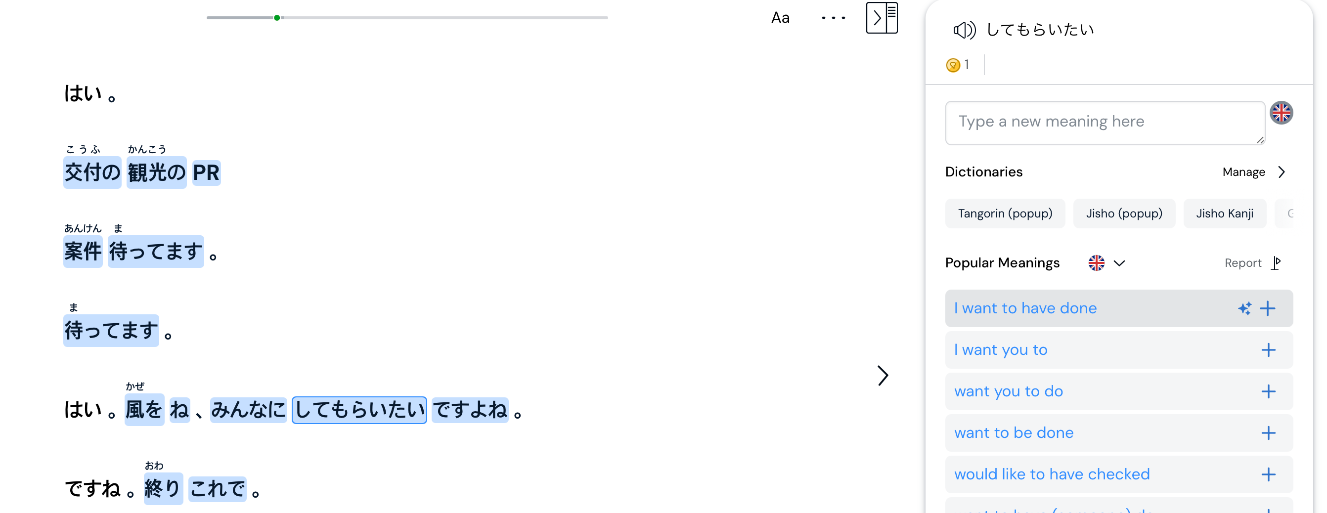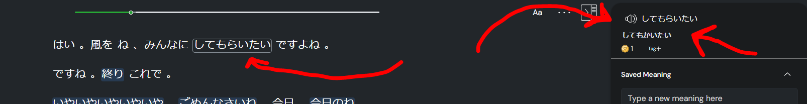 There are constantly errors in the “spelt out hiragana of words.” I don’t really know what to call it (I have a photo for reference). The word in the photo is already hiragana, and this new awful ai is getting it wrong? してもらいたい and they are telling me this pronunciation is してもかいたい. It’s annoying when it yells out the wrong thing when you are reading it out, but at least if it’s hiragana you know you are right (and it is wrong), but it makes these same mistakes when there is kanji too, which is a way bigger problem, because it forces me to leave lingq and go to another website to check. The whole point of lingq is everything is in one place, so when we are paying a lot of money for cheap useless AI it’s pretty annoying.