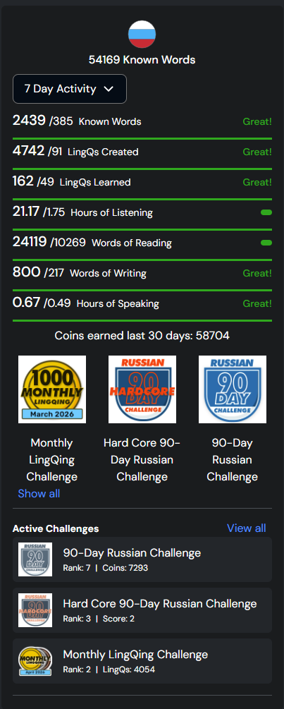 In languages I’m more advanced in, I just listen to podcasts, the news, or ebooks on YouTube when I’m out walking or doing the dishes or something.