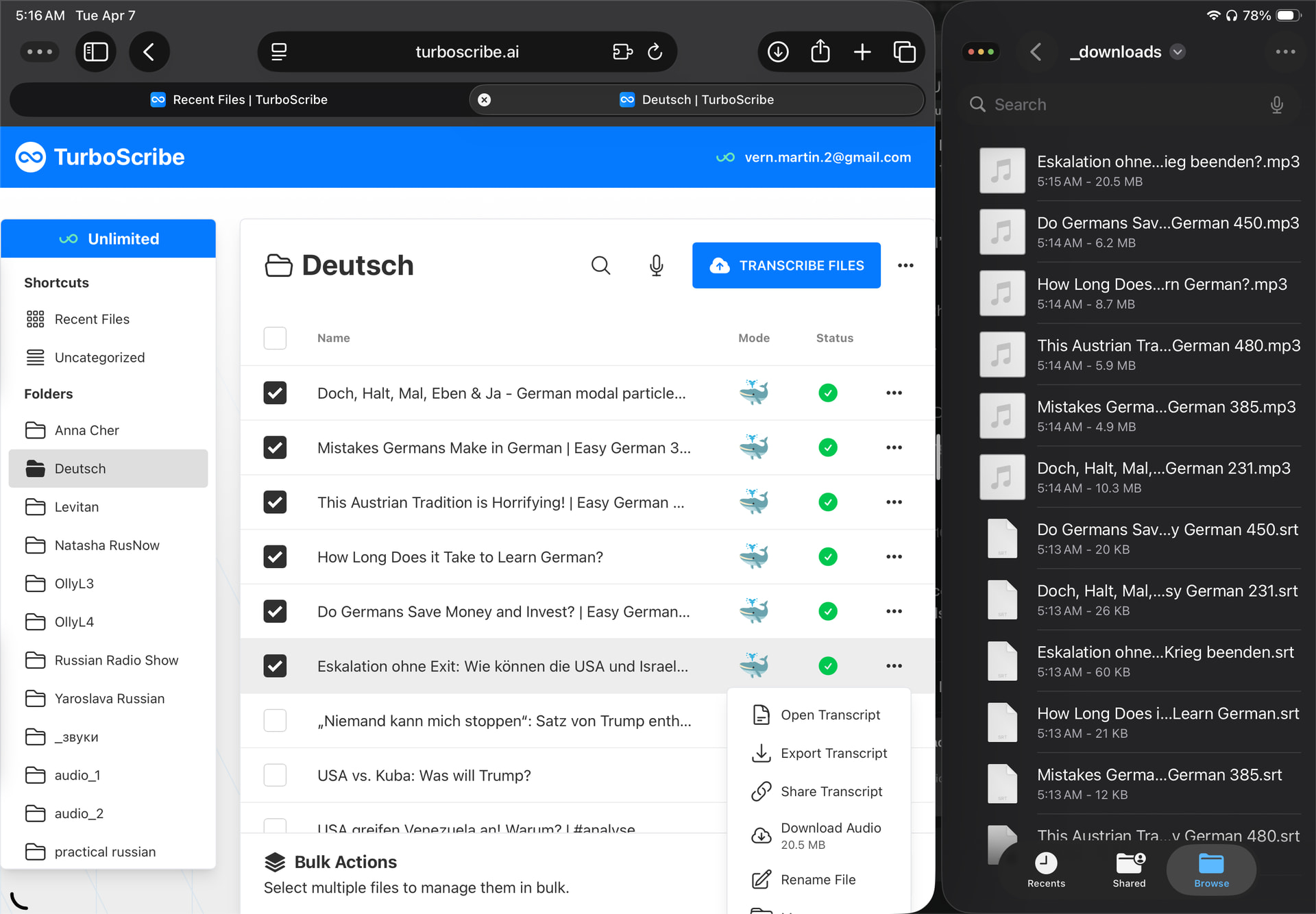 Six new lessons for German listening today. BTW: I pay for both Youtube (to get rid of ads) and Turboscribe (because I use it that much). These are both great investments for my language learning. Used daily.