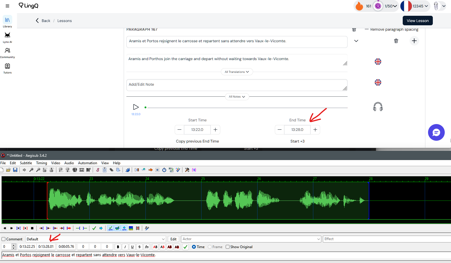 Below is the last sentence. I set the in/out point same as Aegisub/audacity and lingQ based on waveform.