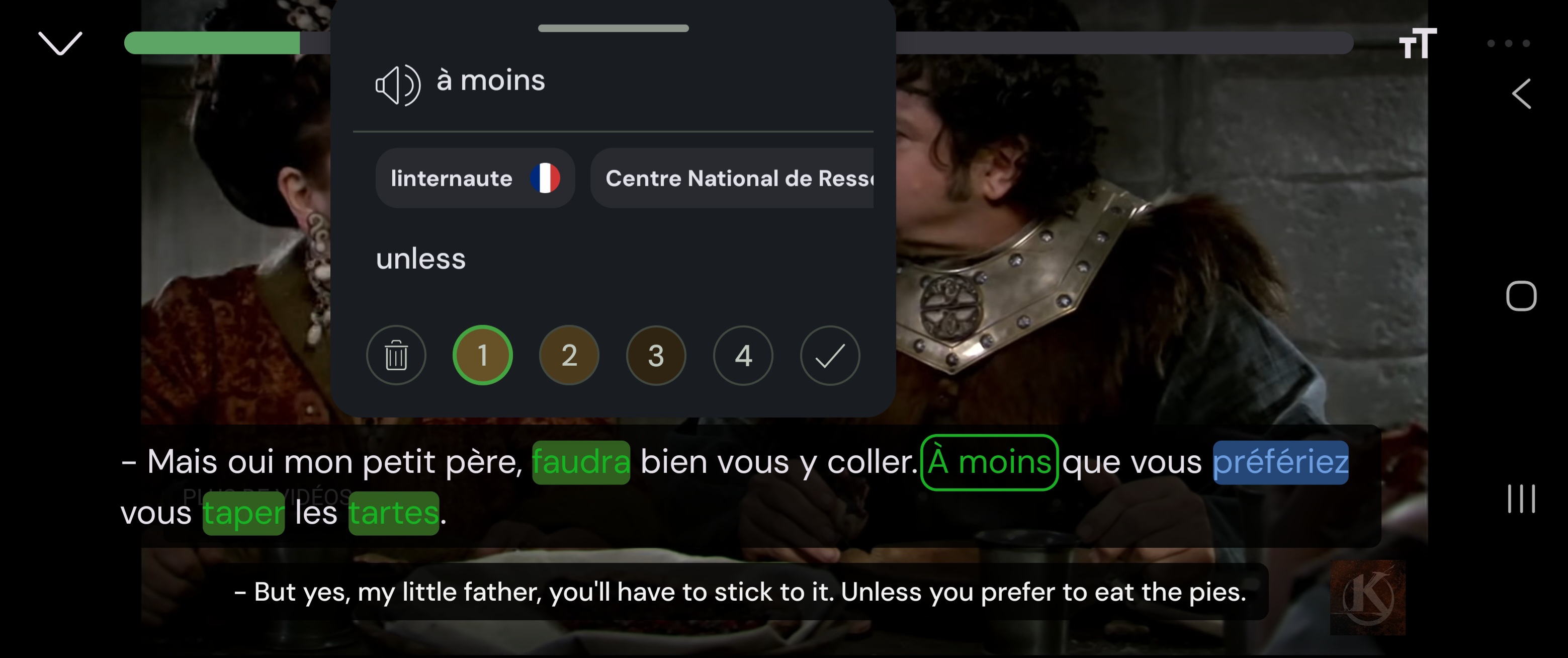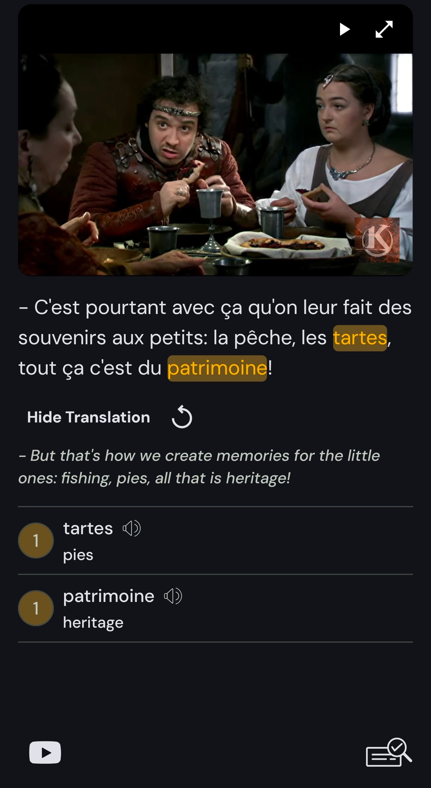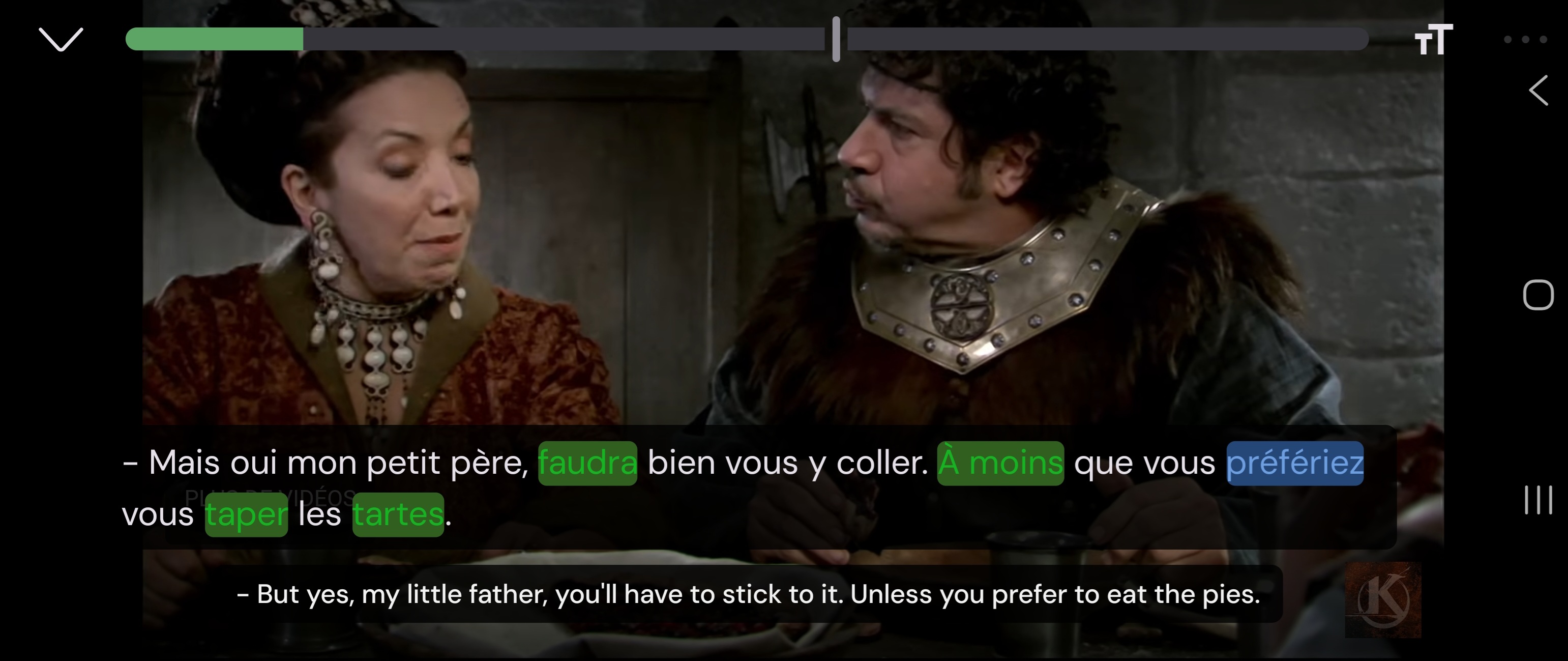 • It would also be great if the LingQ (or at least the first few words of the LingQ) could be displayed above the word itself when watching in full-screen mode. This would significantly enhance immersion, and in many cases would remove the need to pause the video at all.