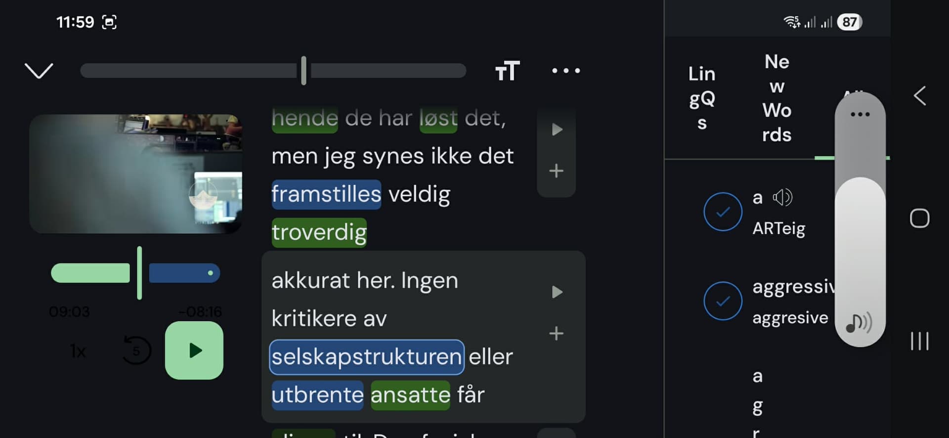 That visible video compact playback control is useful. I don’t have to finger-chase those pesky moving play buttons on the right of each sentence.