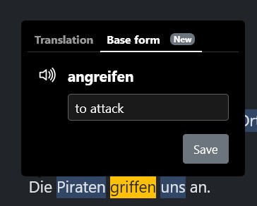 Same works for Lingo Champ, which is a very poor Lingq alternative, but they offer the option to save the verb in its base form, and thus learn it that way via review process.