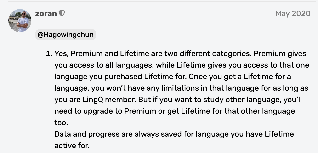 “…you won’t have any limitations in that language for as long as you are LingQ member”.