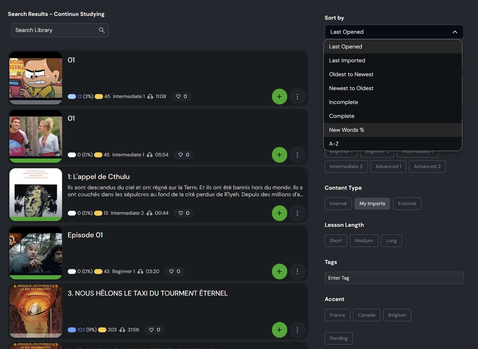 With all that, user can sort all lesson by date of completion/review and by percentage of LingQ % (yellow words). User can then proceed to review lesson completed example⌠1 week ago with the most yellow words or LingQs ready for review