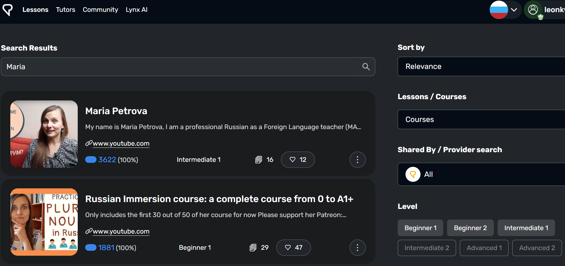 But when I go to Courses / View All, and search for “Maria”, it does not find that course.