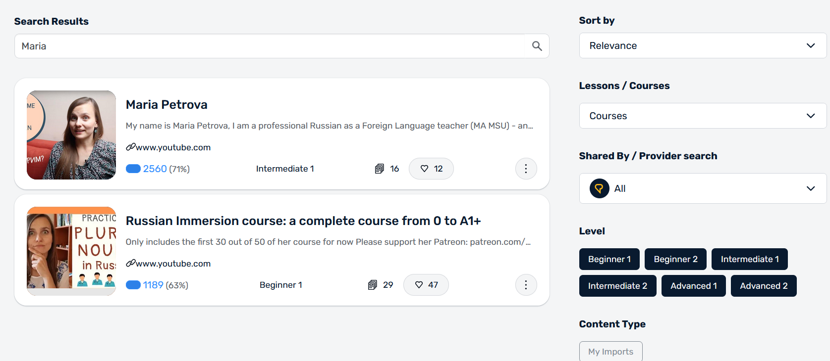 When I do that I get different results, but I don’t find my Maria Petrova course, nor the public one either.