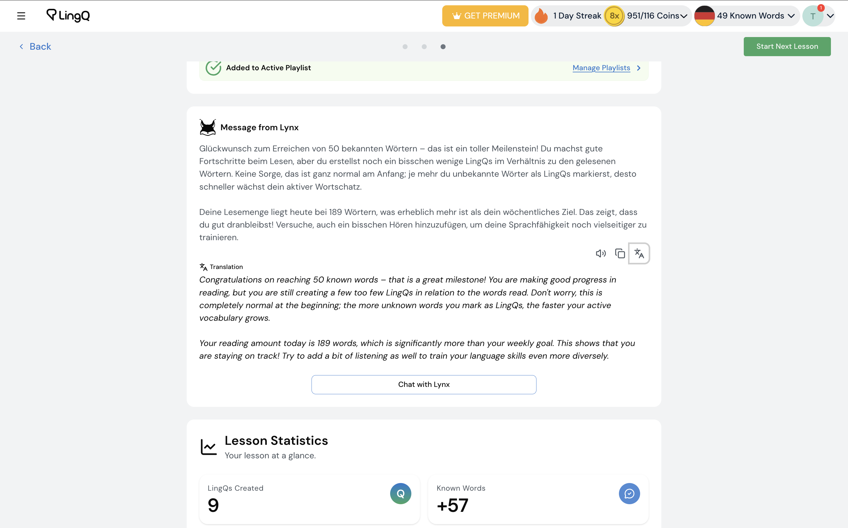 - (COMING SOON) Coach feedback after lessons: when you complete a lesson in the LingQ Reader, you will see short AI feedback from Lynx Coach, giving you a quick observation or suggestion based on how you’re studying.