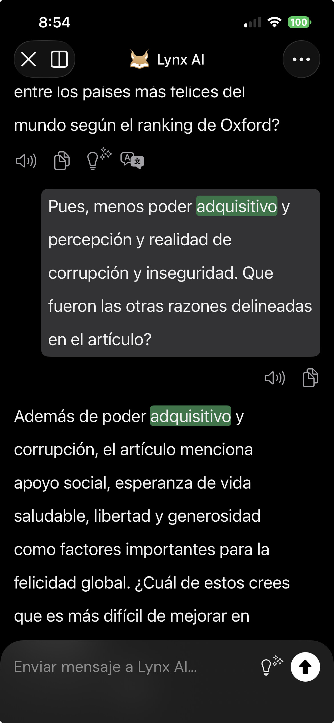 Because Lynx is integrated with LingQ, you can also tap or click new words and phrases in Lynx’s replies to save them as LingQs. These saved LingQs are added directly to your vocabulary database.