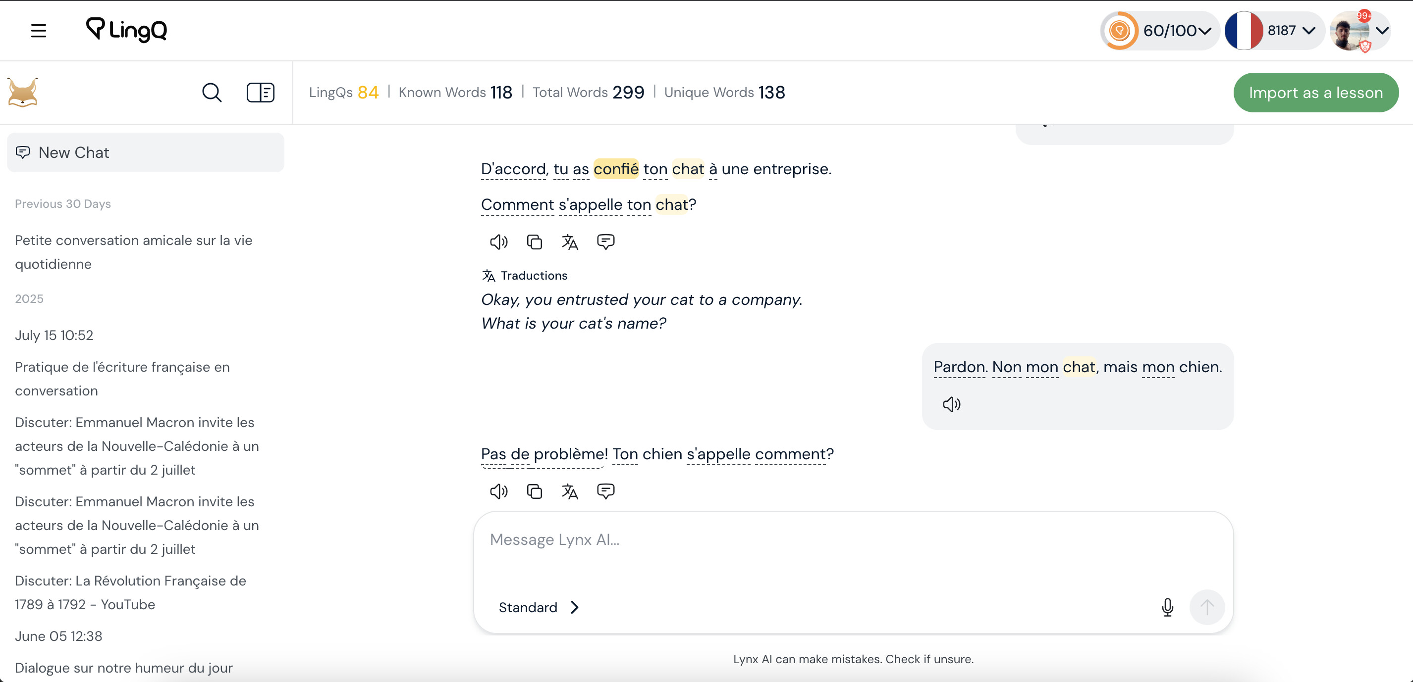 You don’t need to be in a specific lesson to use Lynx. You can simply open the chat, start talking in your target language, and let Lynx connect the conversation to your LingQ account, content, and stats as needed.