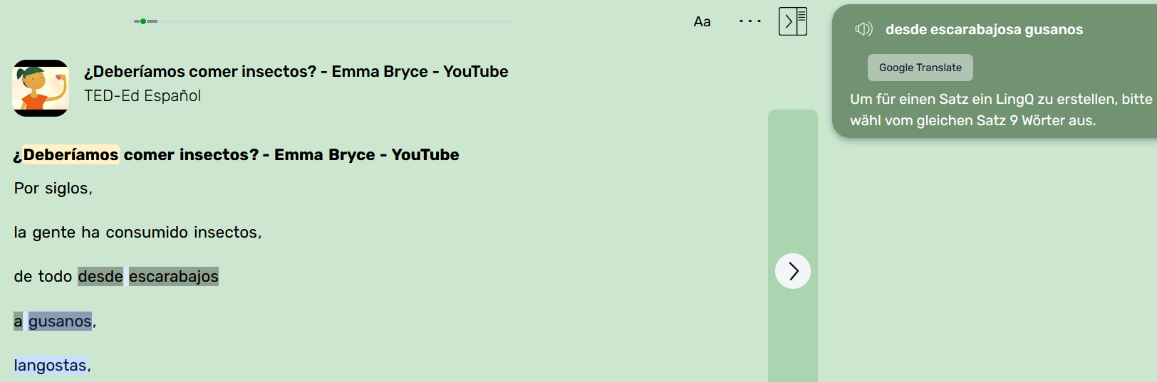 I wanted to create a LingQ selecting the sentence “desde escarabajos a gusanos”.